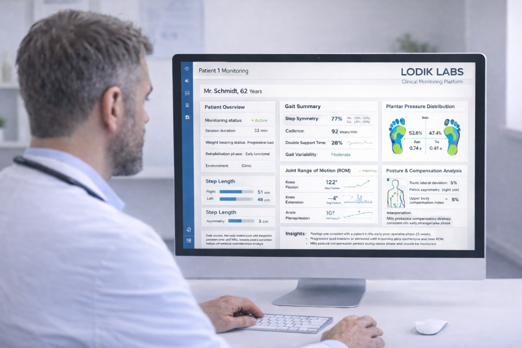 Physicians and physiotherapists access a secure clinical dashboard providing biomechanical data, including gait parameters, plantar pressure distribution, joint-related range of motion, and posture-related metrics, to support clinical and rehabilitative decision-making.