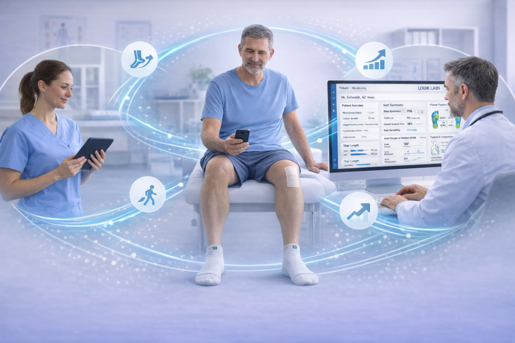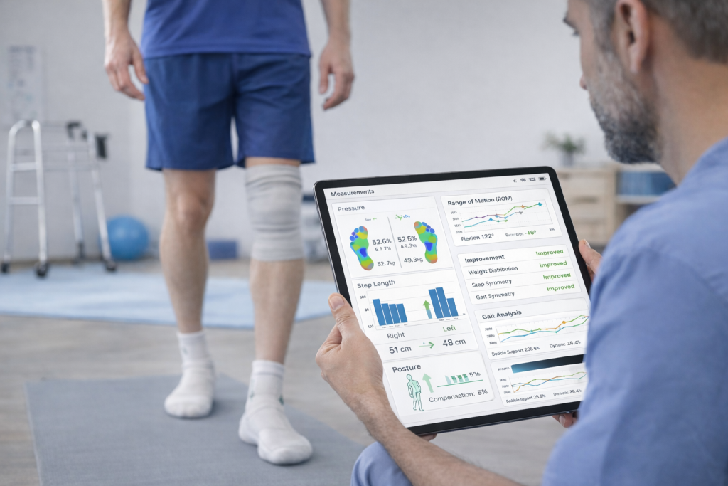 Our system combines an intelligent insole embedded in a dedicated technical sock with miniaturized IMU sensors applied via adhesive skin patches, enabling continuous acquisition of gait, posture, and joint range-of-motion parameters in both clinical and real-world settings.